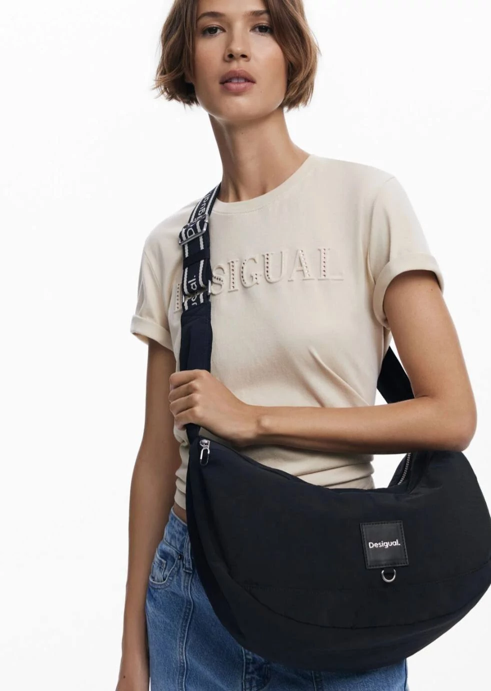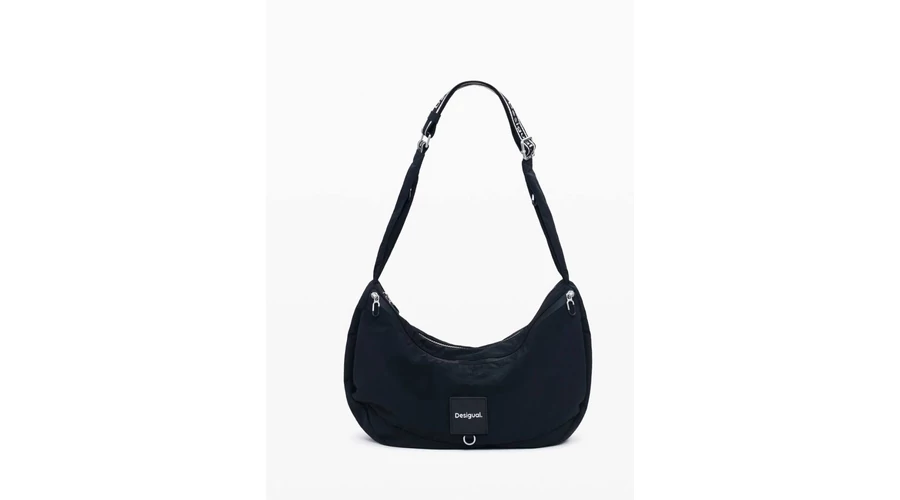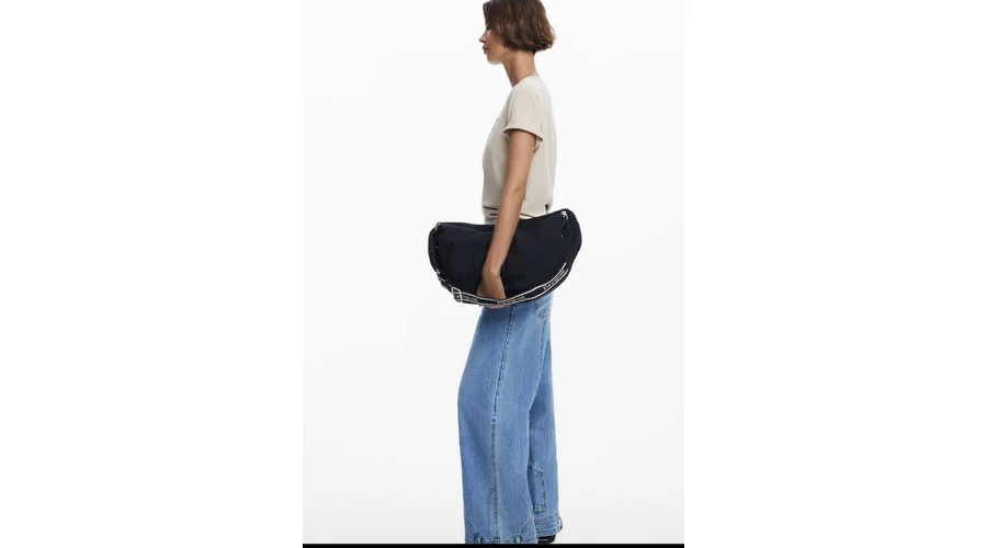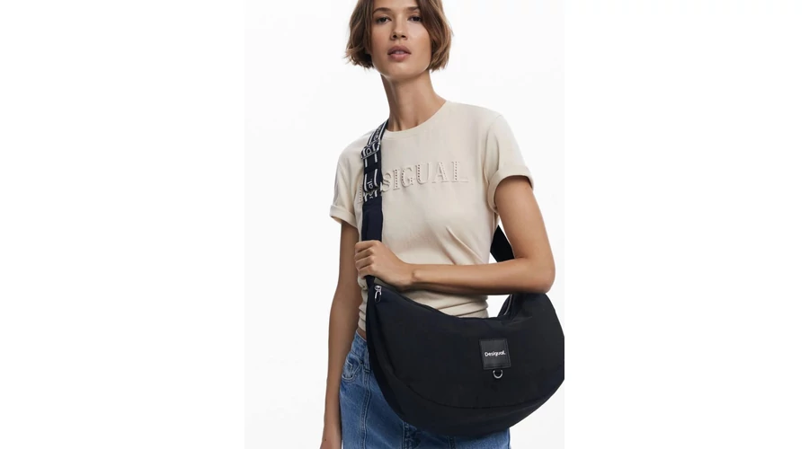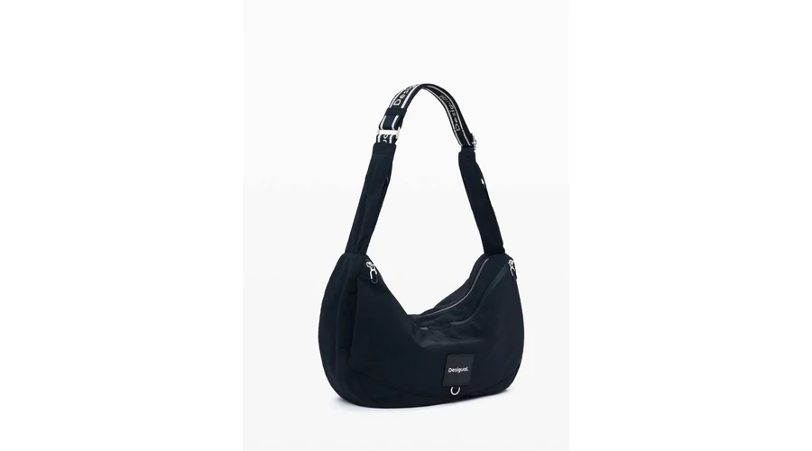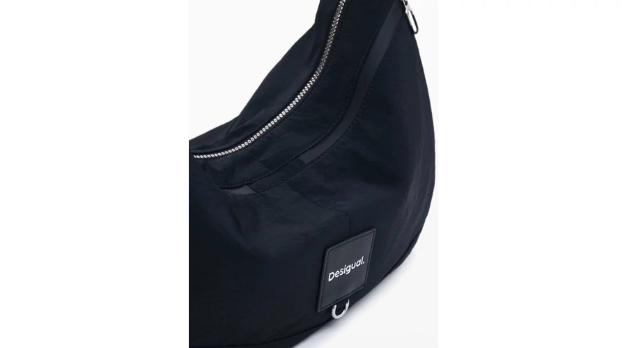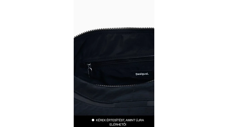 Fekete, orkán anyagú, zipzáras, nagyméretű, félkör alakú, több zsebes utazótáska