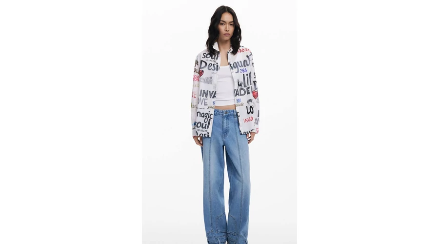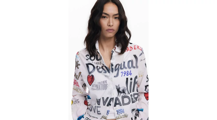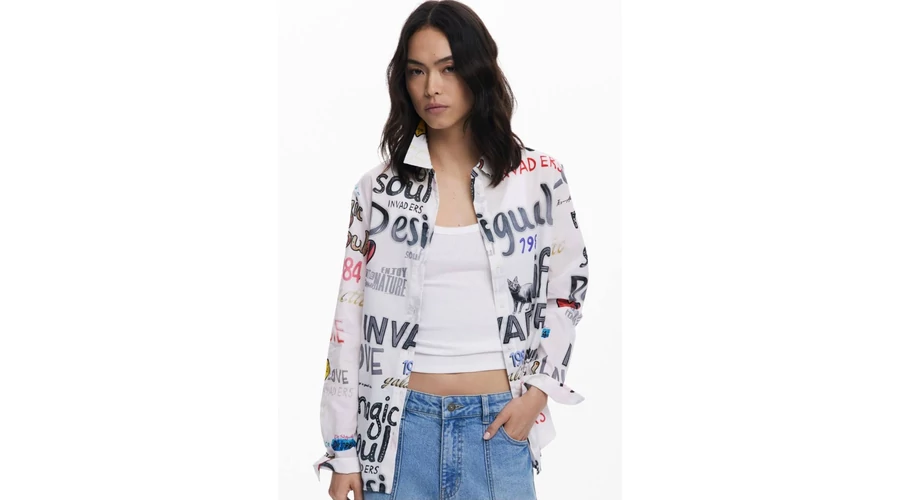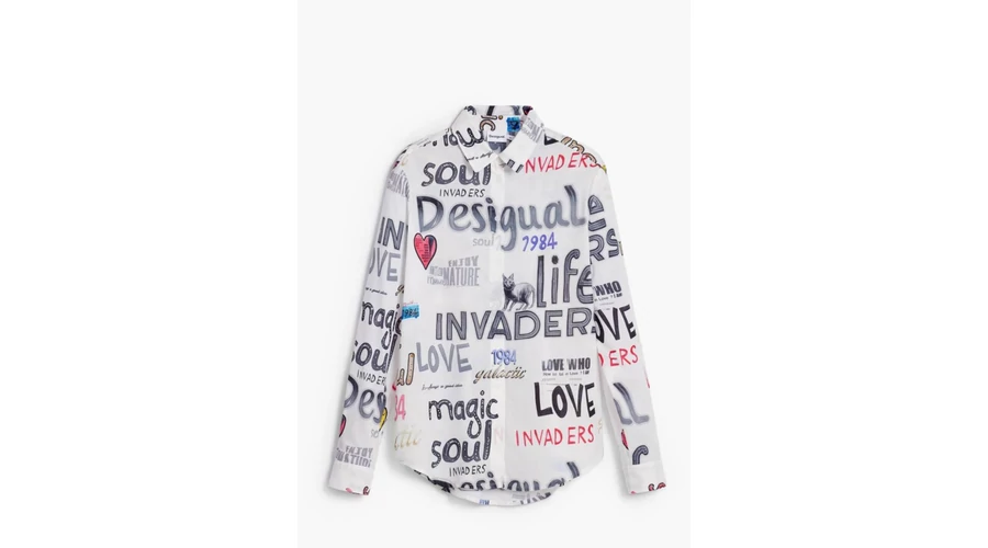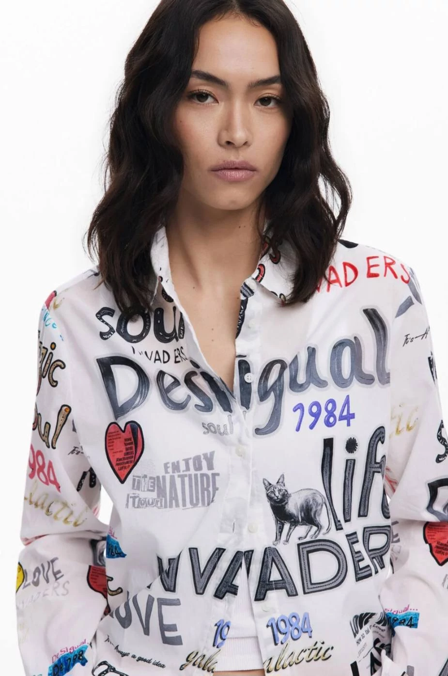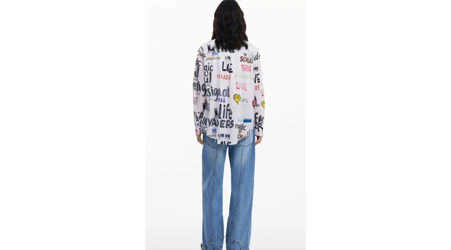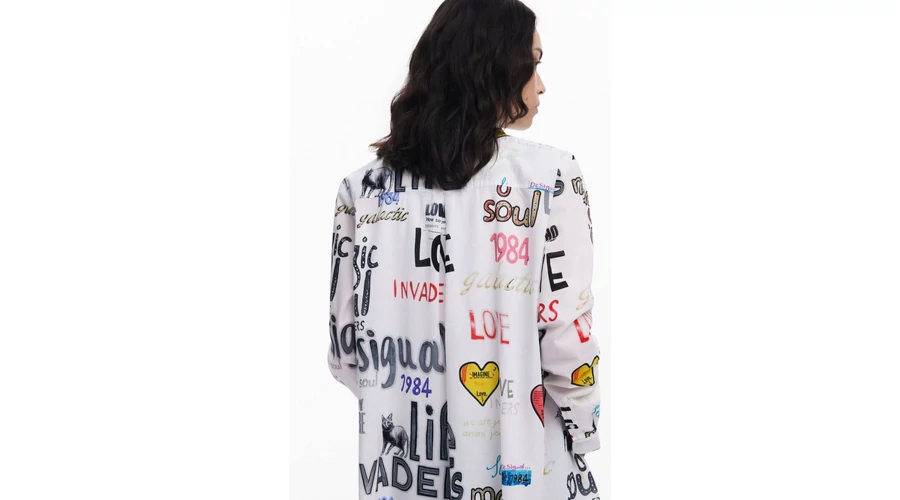 Fehér alapon feliratos és mintás, hosszú ujjú ing.