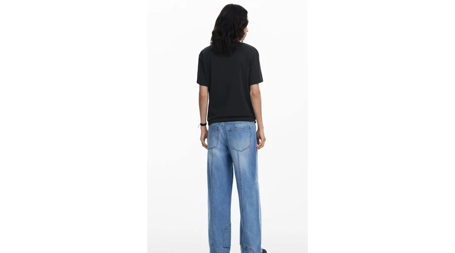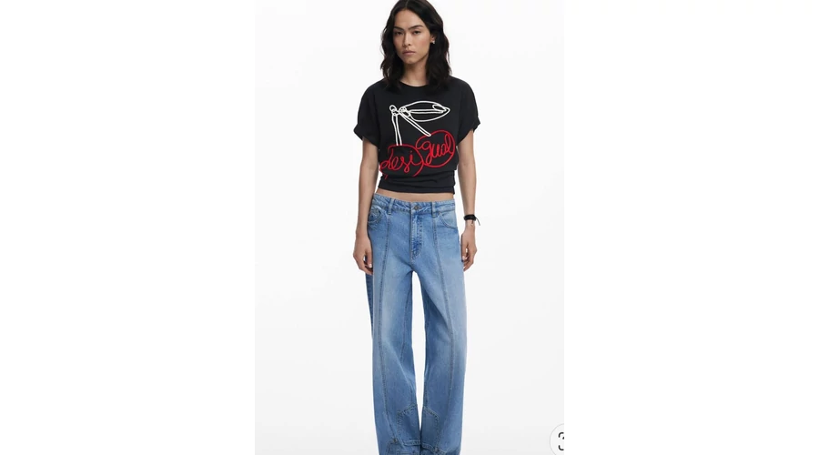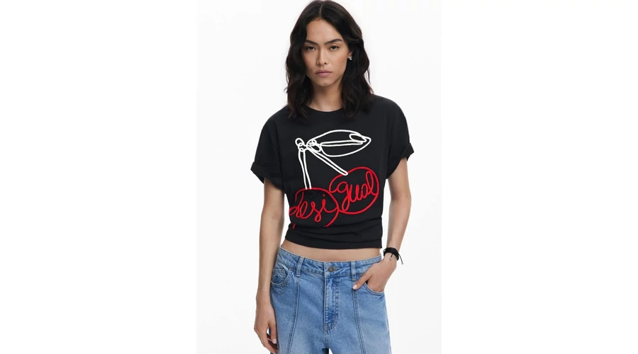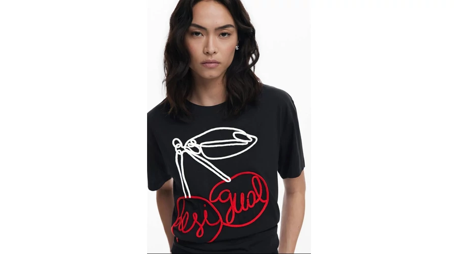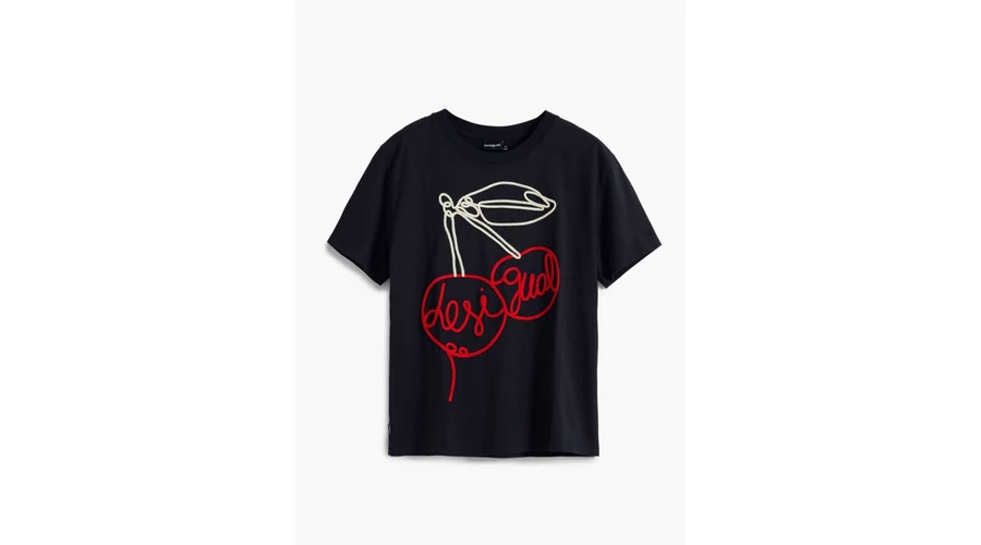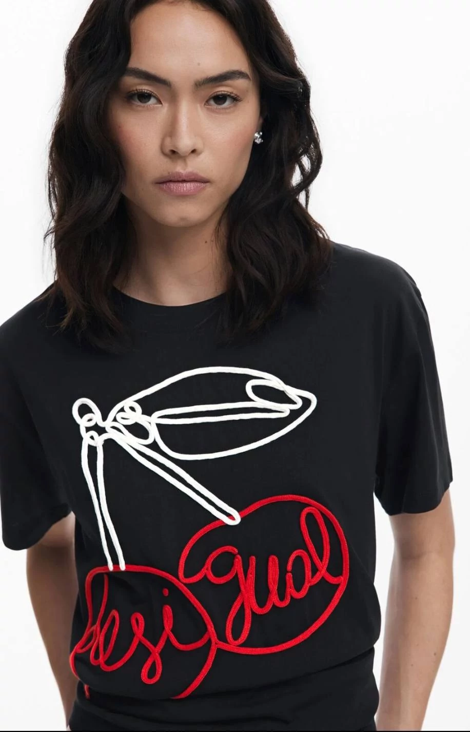 Fekete, cseresznyemintával hímzett, rövid ujjú, kerek nyakú, normál fazonú póló