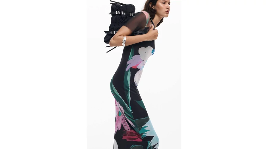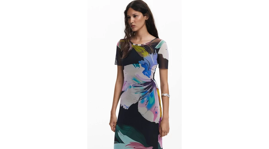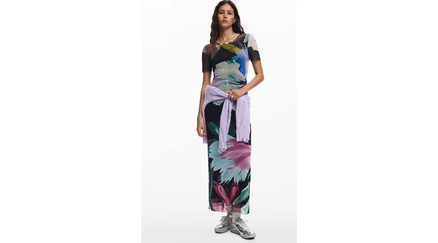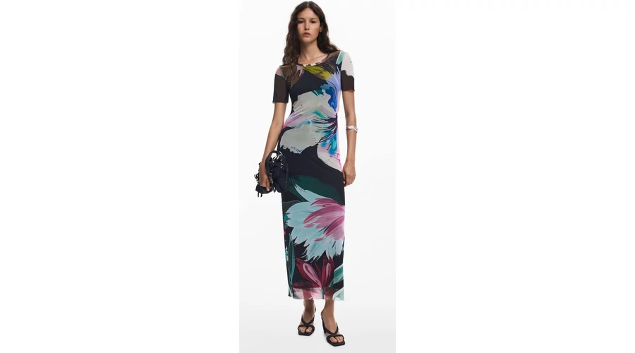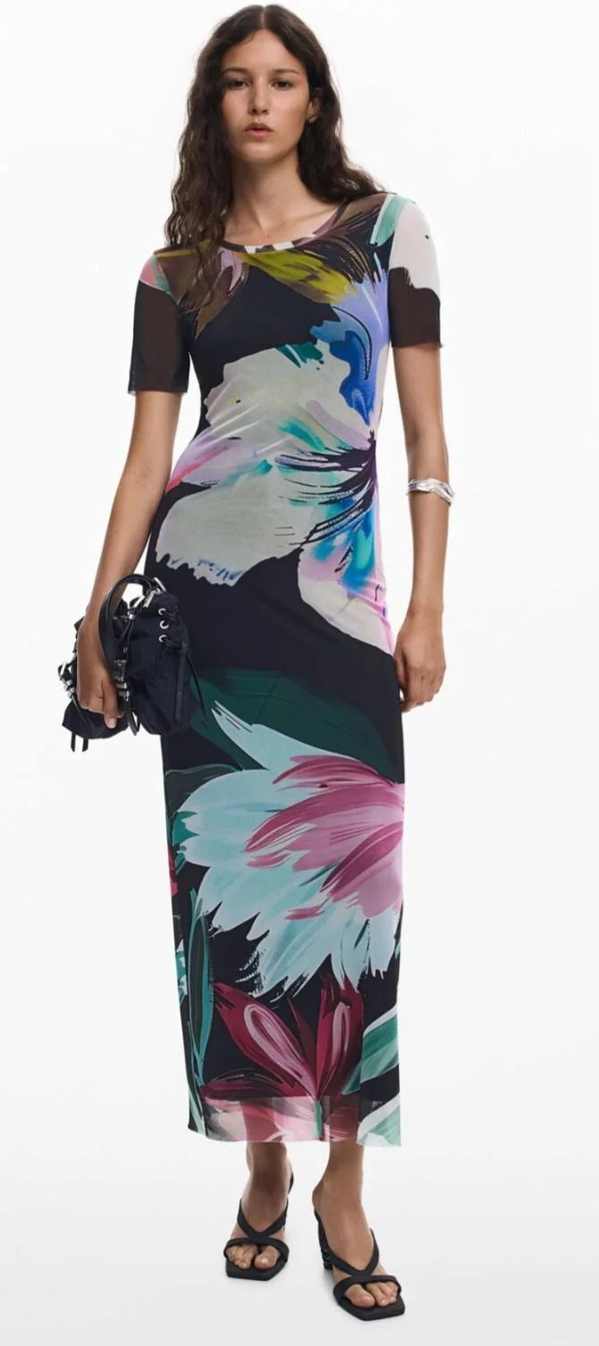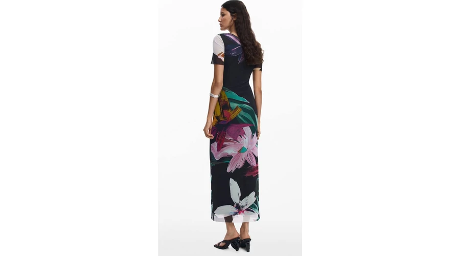 Kétrétegű, tüllös anyagú, akvarell virágmintás, rövid ujjú, maxi ruha.