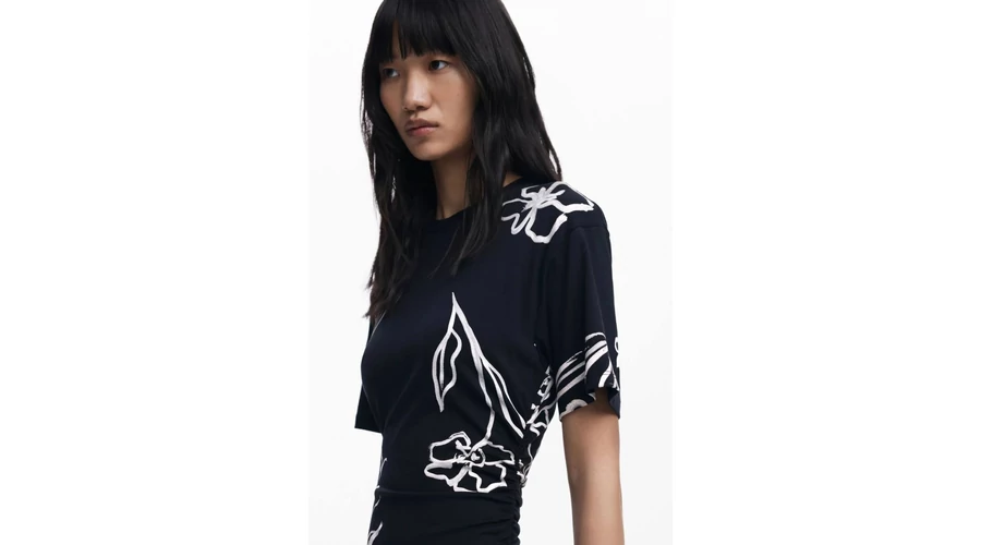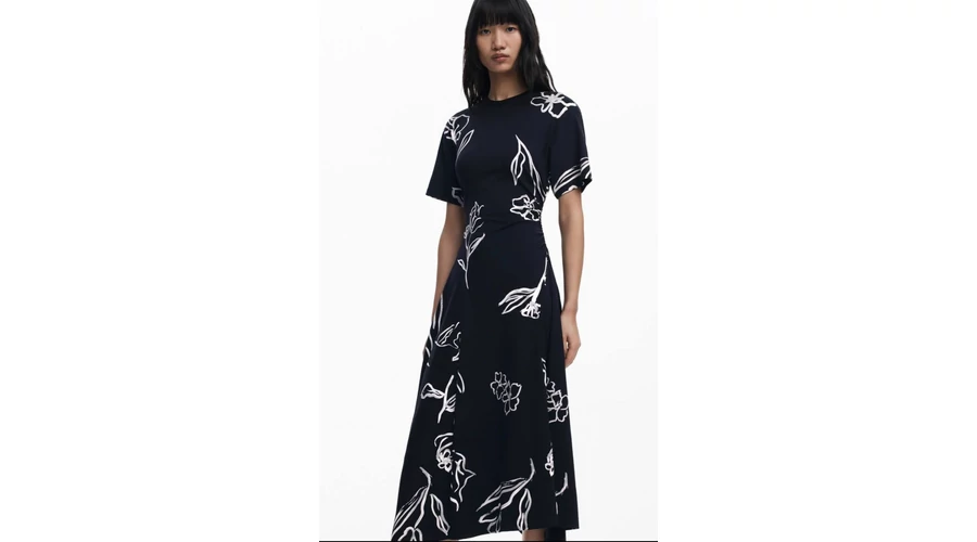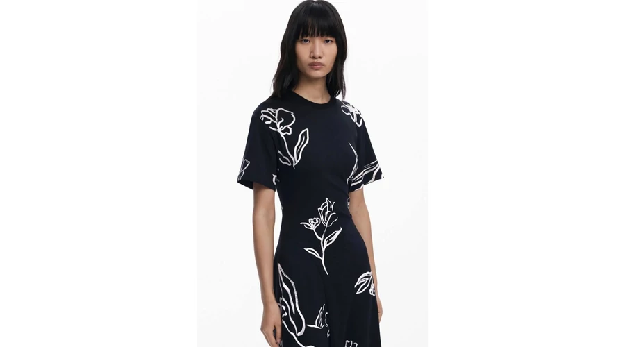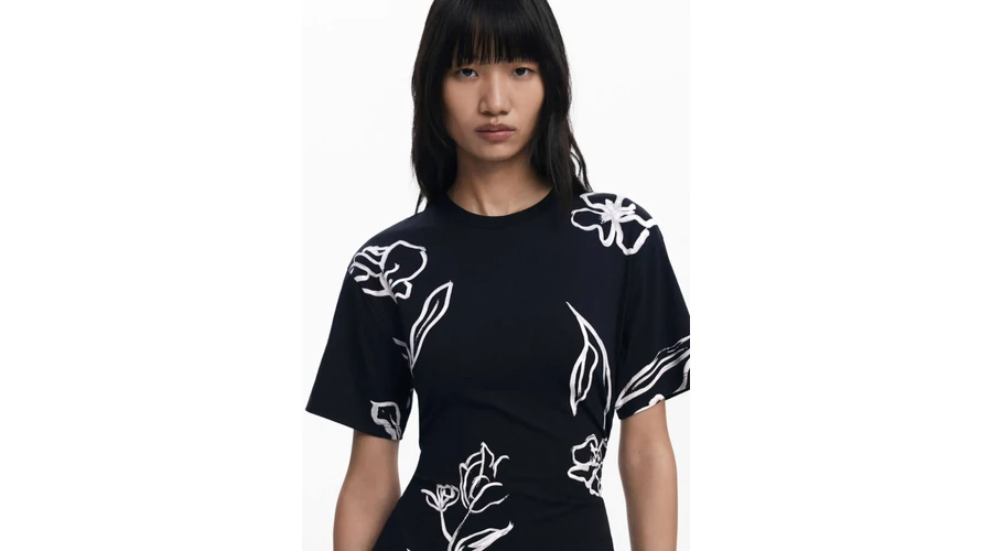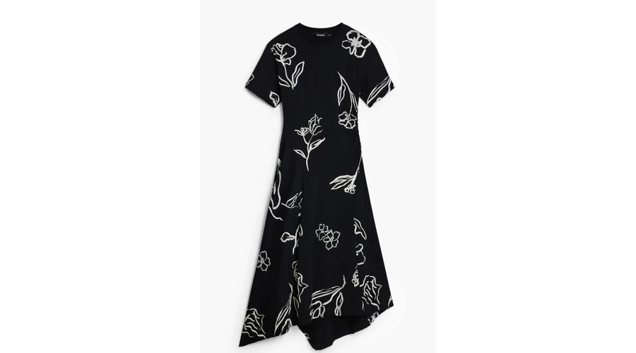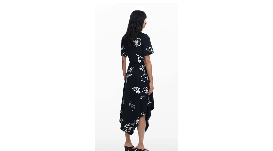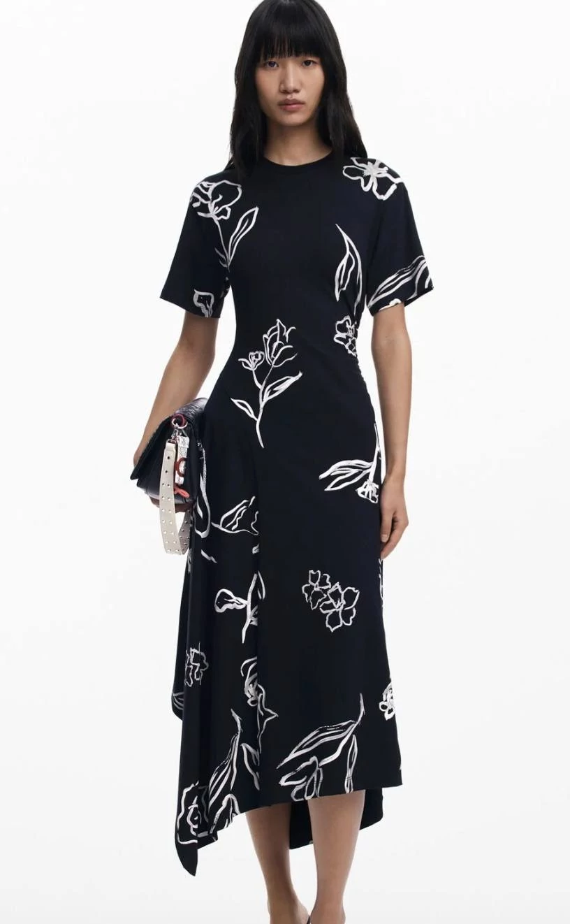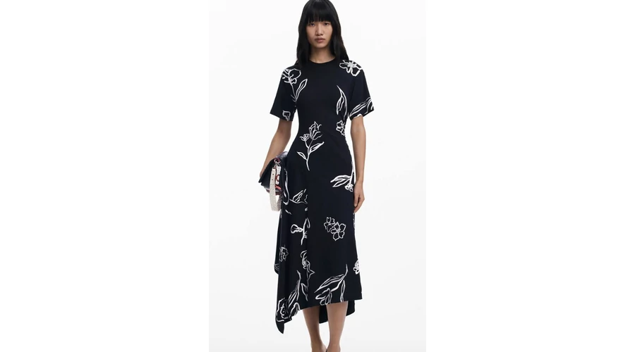 Fekete, fehér virágmintás, rövid ujjú, asszimetrikus aljú, maxi ruha.