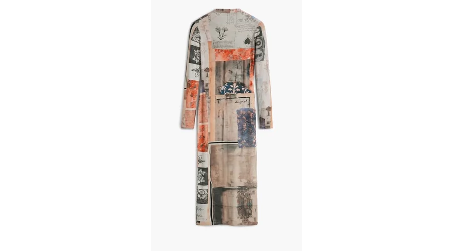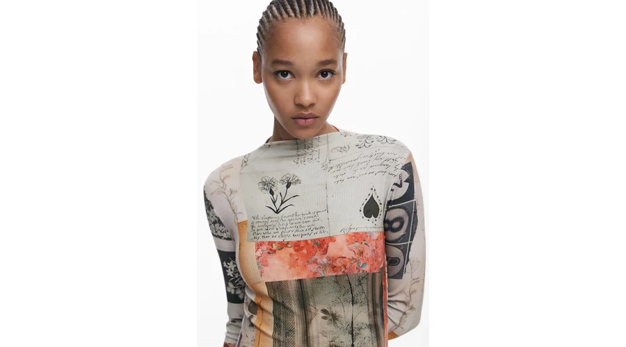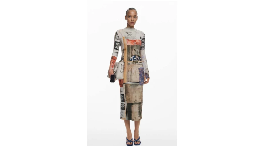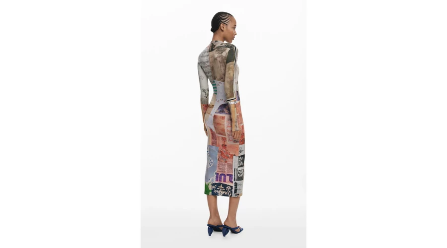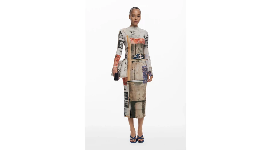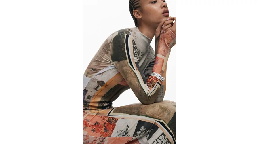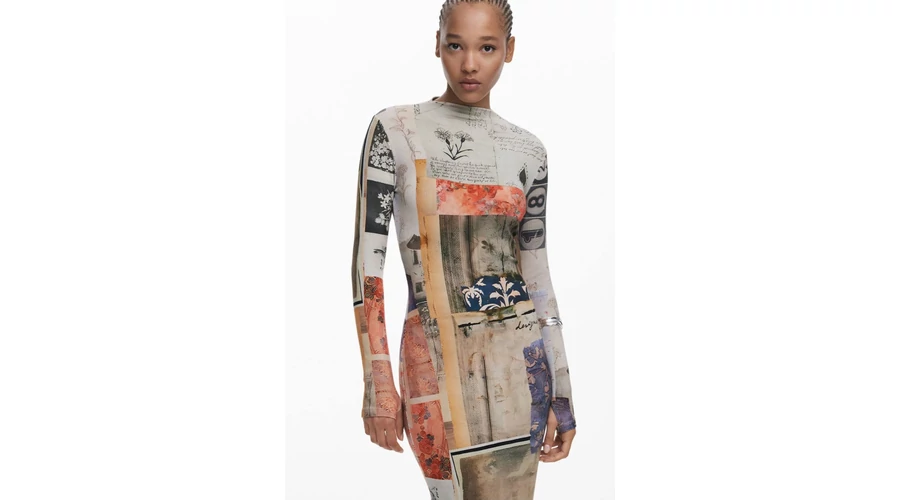 Bézs, színes mintás feliratos, hosszú ujjú kollázsruha. Rugalmas, testre símulós anyag.